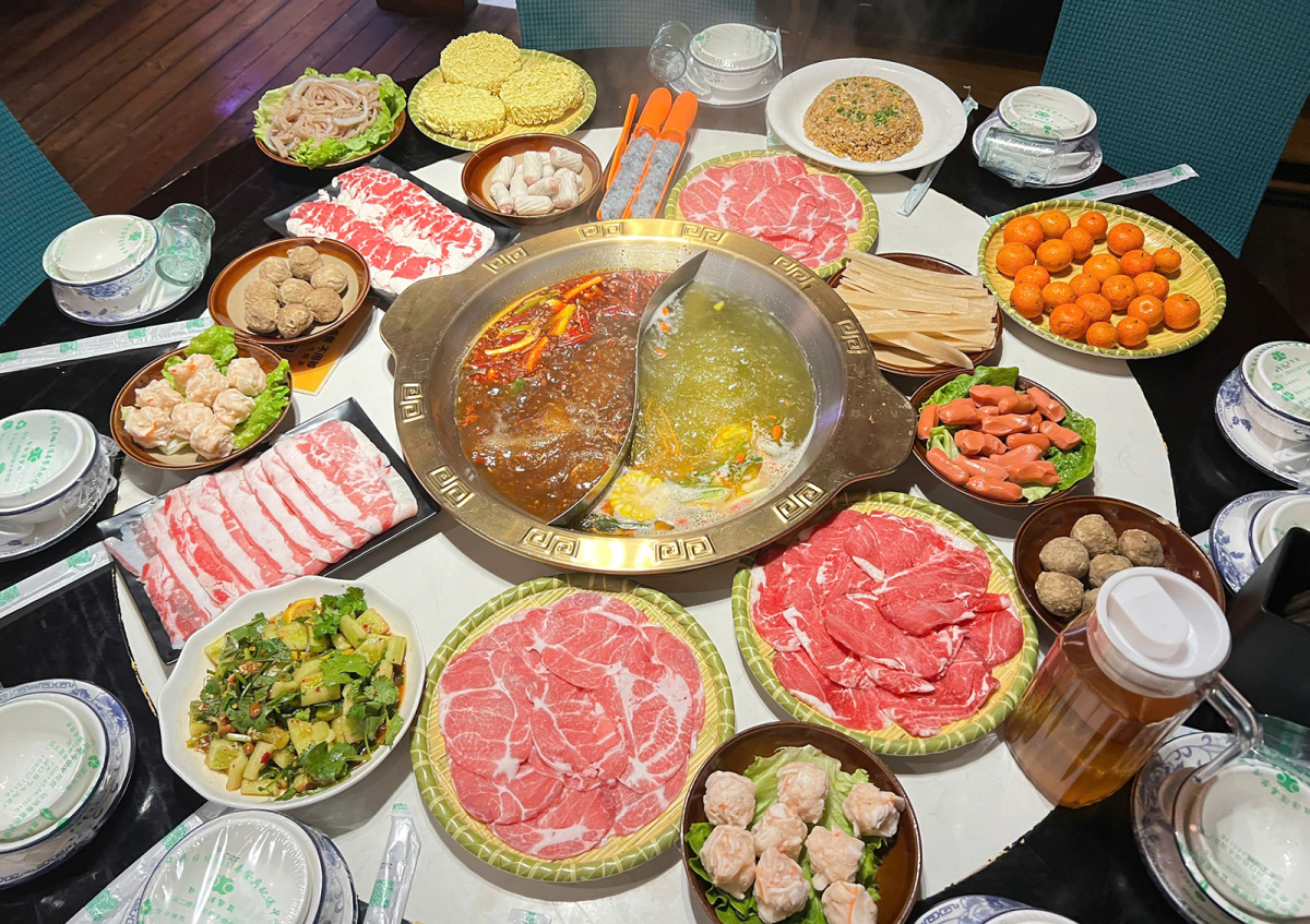 Du khách có thể thưởng thức tại các quán ăn ven đường, trong nhà hàng, với các món lẩu như lẩu Tứ Xuyên, lẩu bò (ảnh), vịt quay, bánh bao xá xíu, thịt kho.
